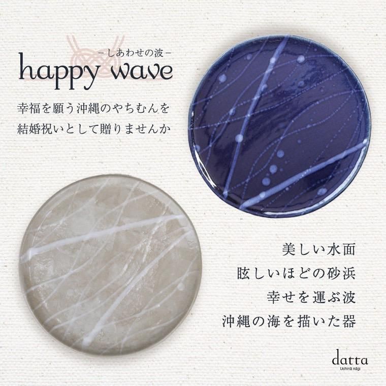 季節や一日の中でも表情を変える沖縄の海。 海原に続く波は寄せては返し、悠久の時を紡ぎます。 終わりなく常にゆったりと打ち寄せる波は 未来永劫平和で穏やかな時が続く象徴として 人々の心に安らぎと癒しを与えます。 ”しあわせの波”と名付けた「happy wave」は 美しい水面、眩しいほどの砂浜 そして幸せを運ぶ波をイメージした器たちです。 美味しい時間に彩りを添え笑顔を届けます。