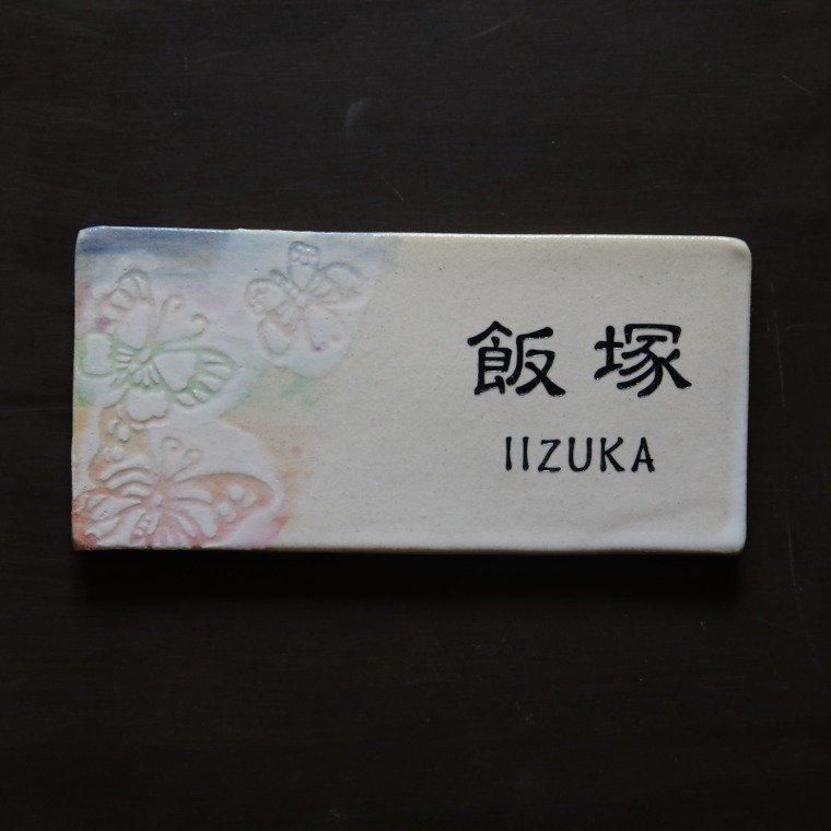 沖縄の伝統工芸品「紅型染め」をオマージュして製作、色彩と色の組み合わせが和とは異なる南国独特のデザインです。沖縄陶器で表現できないものか試作と試験を重ね、陶器の紅型表札が完成しました。素材は陶器となりますので屋外で末永くお使いいただける一品です。